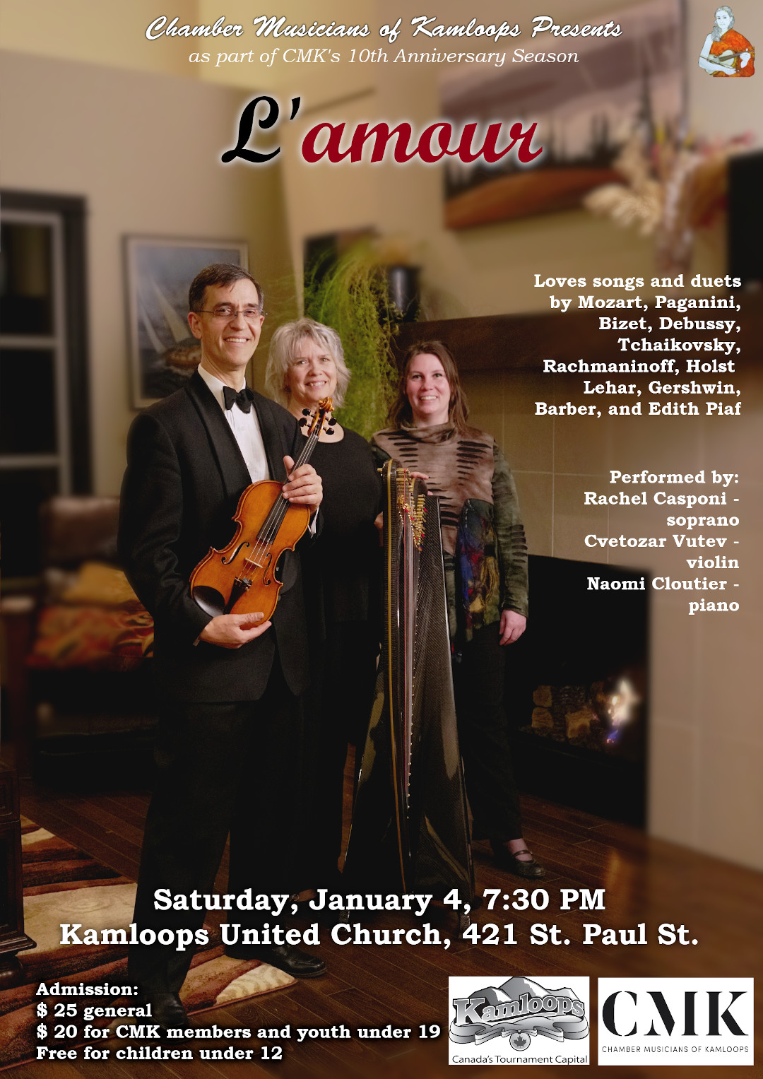 Love songs and duets by Mozart, Paganini, Bizet, Debussy, Tchaikovsky, Rachmaninoff, Holst, Lehar, Gershwin, Barber, and Edith Piaf.